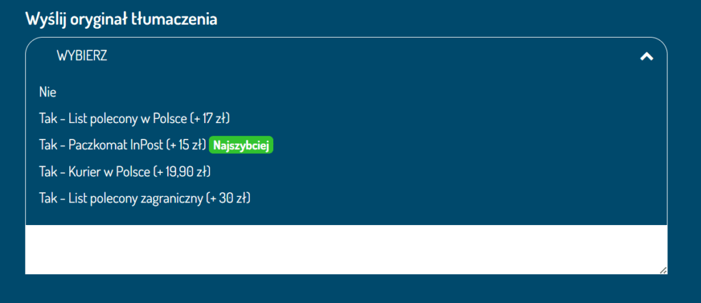 - Zaznaczasz, za pośrednictwem której z firm, chcesz otrzymać gotowe tłumaczenie do rąk własnych. Tak, Paczkomat też wchodzi w grę!